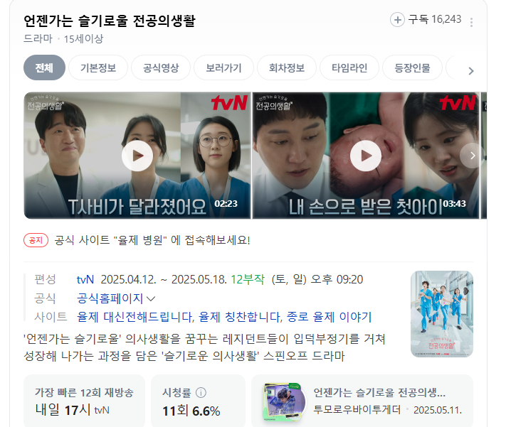 언젠가는 슬기로울 전공의생활은 2025년 4월 12일부터 5월 18일까지 tvN에서 방영된 총 12부작의 드라마입니다.