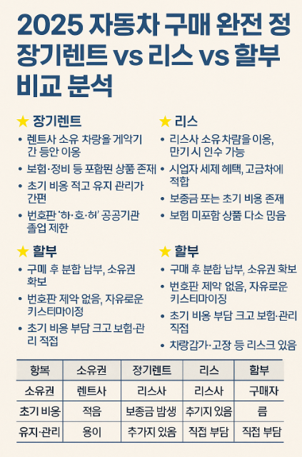 자동차 구매 전 반드시 알아야 할 필수 정보! 2025년 기준 장기렌트, 리스, 신차할부의 차이점과 장단점을 완벽 비교 분석합니다.